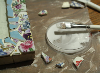 I got messy this week, with my mosaic mirror. Annoyingly, it's not one of those crafts you can do sitting by the fire, watching telly, with the puppy on your lap. You need a dust mask, industrial strength gardening gloves (which make holding anything like trying to grab on to a wobbly jelly) your working area (and yourself) wrapped up like a Christo artwork, a plastic bag to work inside to stop shards flying everywhere, goggles, and strictly no puppies.